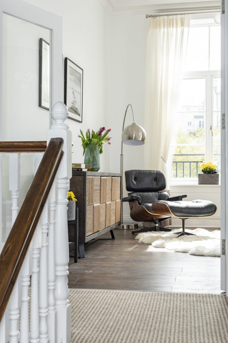 The design concept was based on the lifestyle of our client and the way his house had to work on a daily basis. As this is the home of a busy professional, we created a practical, seamless style. Throughout the space we introduced low-maintenance features and functional subtle elements. The idea behind the renovation was to achieve an interior contemporary bright and clean look. For this we used midcentury elements finished off with scandinavian style touches. In addition to these, extra-high ceilings, tall windows, and moulded plaster rosettes mark a period-like elegance. Bold dark colours in bedrooms and TV room add a fun, playful side to the house, while the new bathrooms bring all the modern comfort.