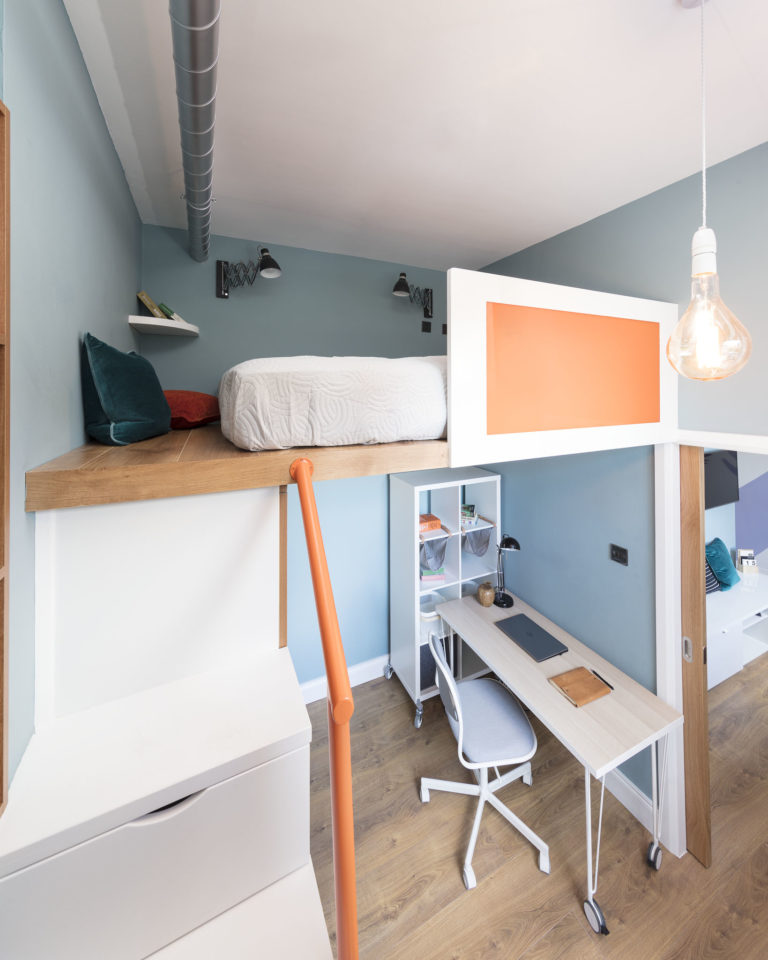 This is one of the smallest apartments we have seen in Dublin so far. The place is a one bedroom flat situated in an old building in city center, close to University and all the cool places. With only 35sqm to work, we had to be creative and layer all the functions needed vertically taking advantage of the high ceilings. With carefully selected colors and a well thought layout we changed the space into a smart interior. Everything you need in a tiny one bedroom flat is there. A king size bed, decent size wardrobe, sofa bed, kitchen, breakfast bar, bathroom and laundry area,all ready to be used.
